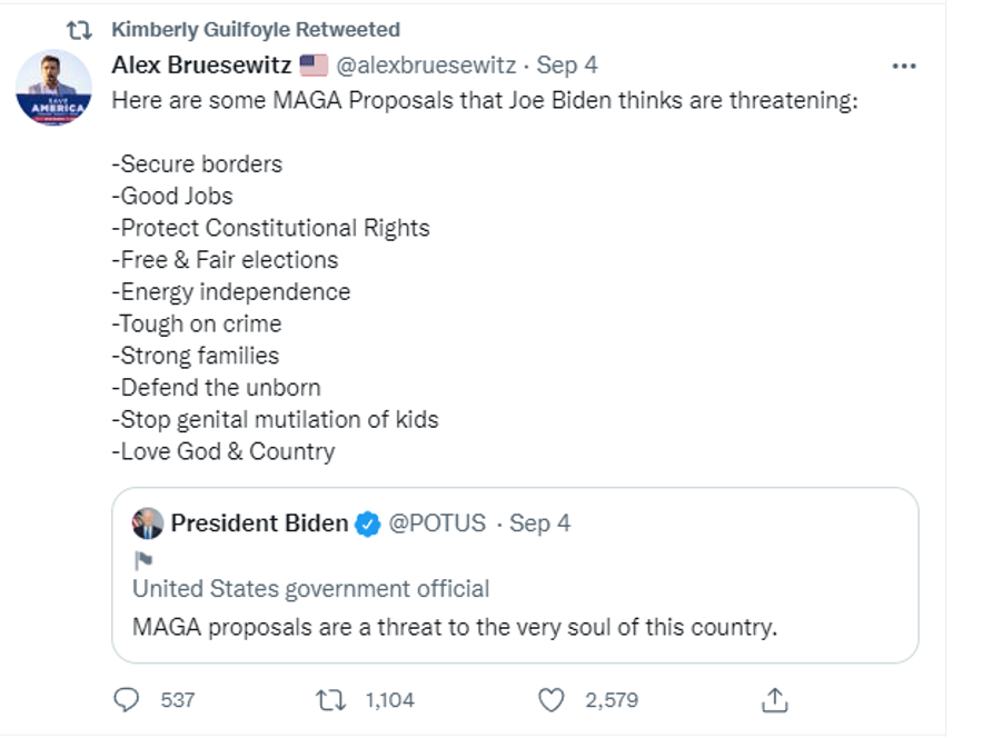 Really? Joe Biden thinks that MAGA policies are a threat to our country. | | |