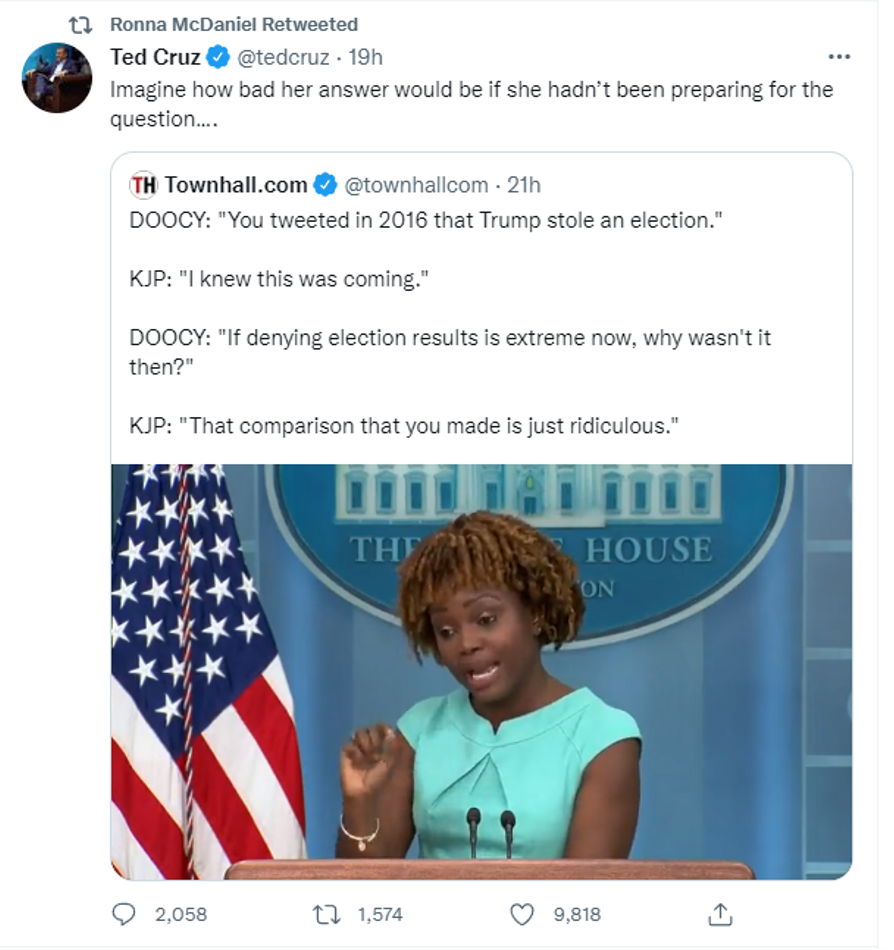 Change of heart: Peter Doocy confronted WH Press Secretary Karine Jean-Pierre with her old tweets that claimed Trump stole the 2016 election, but according to liberals those who deny election results NOW are extremists. | | |
