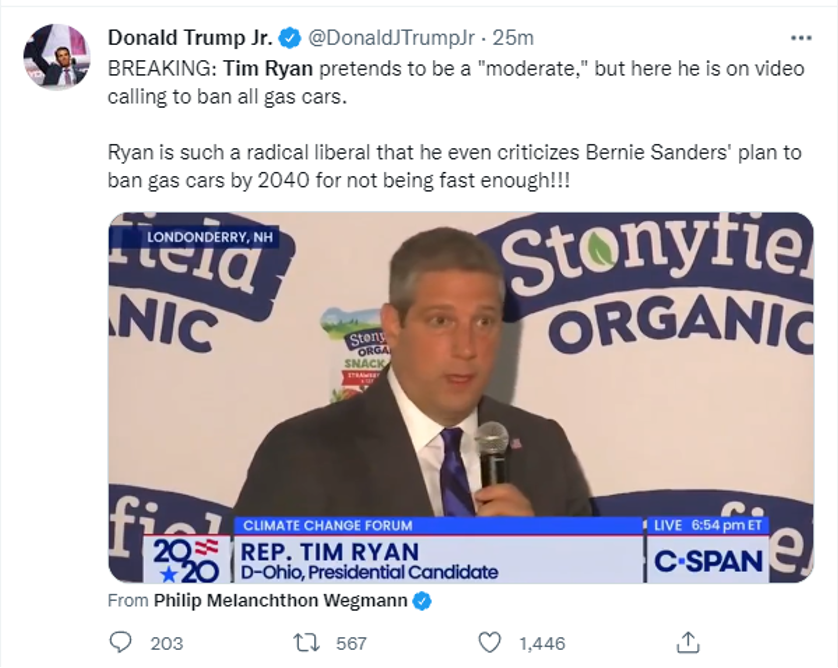 Not so moderate: Tim Ryan of Ohio is attempting to run as a moderate candidate despite him taking a tougher stance than Bernie Sanders on banning gas cars before 2040. | | |